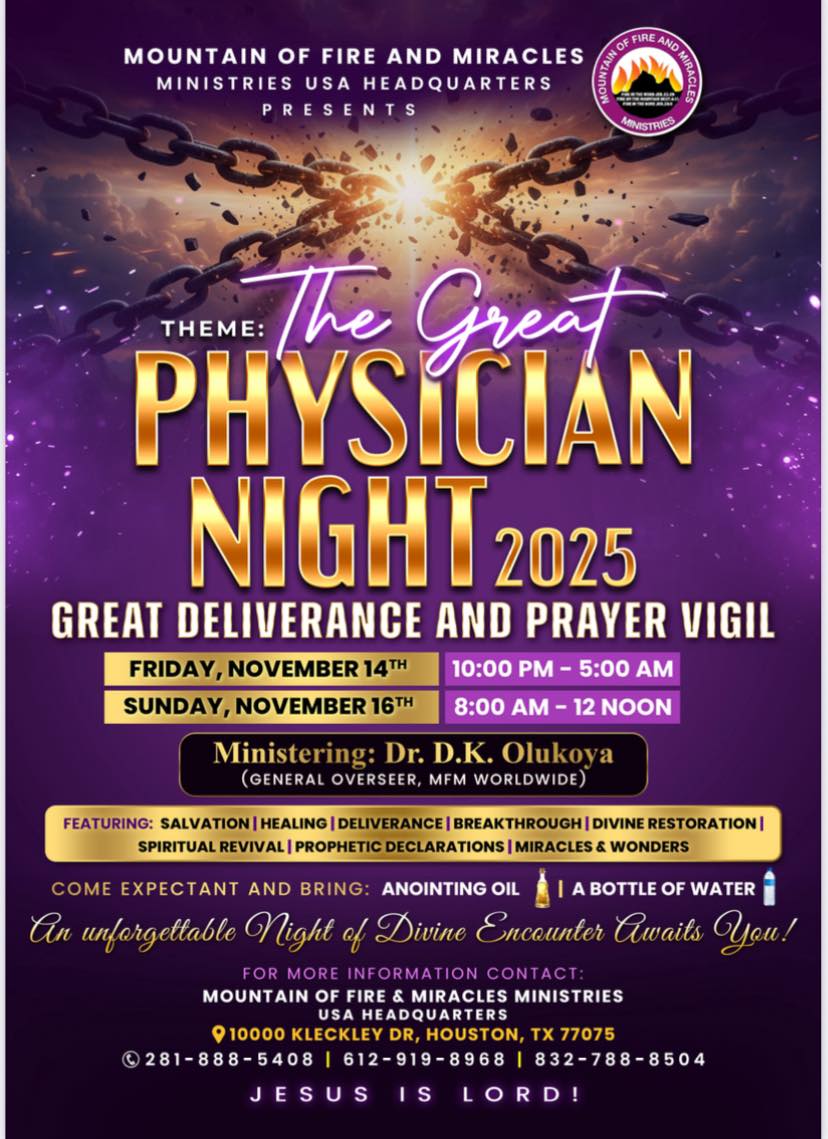 MFM USA Prayer City 10000 Kleckley Dr, Houston, TexasPlease join us for an unforgettable Night of Divine Encounters!! MFM USA Headquarters presents - The Great Physician Night 2025 - Great Deliverance and Prayer Vigil. […]